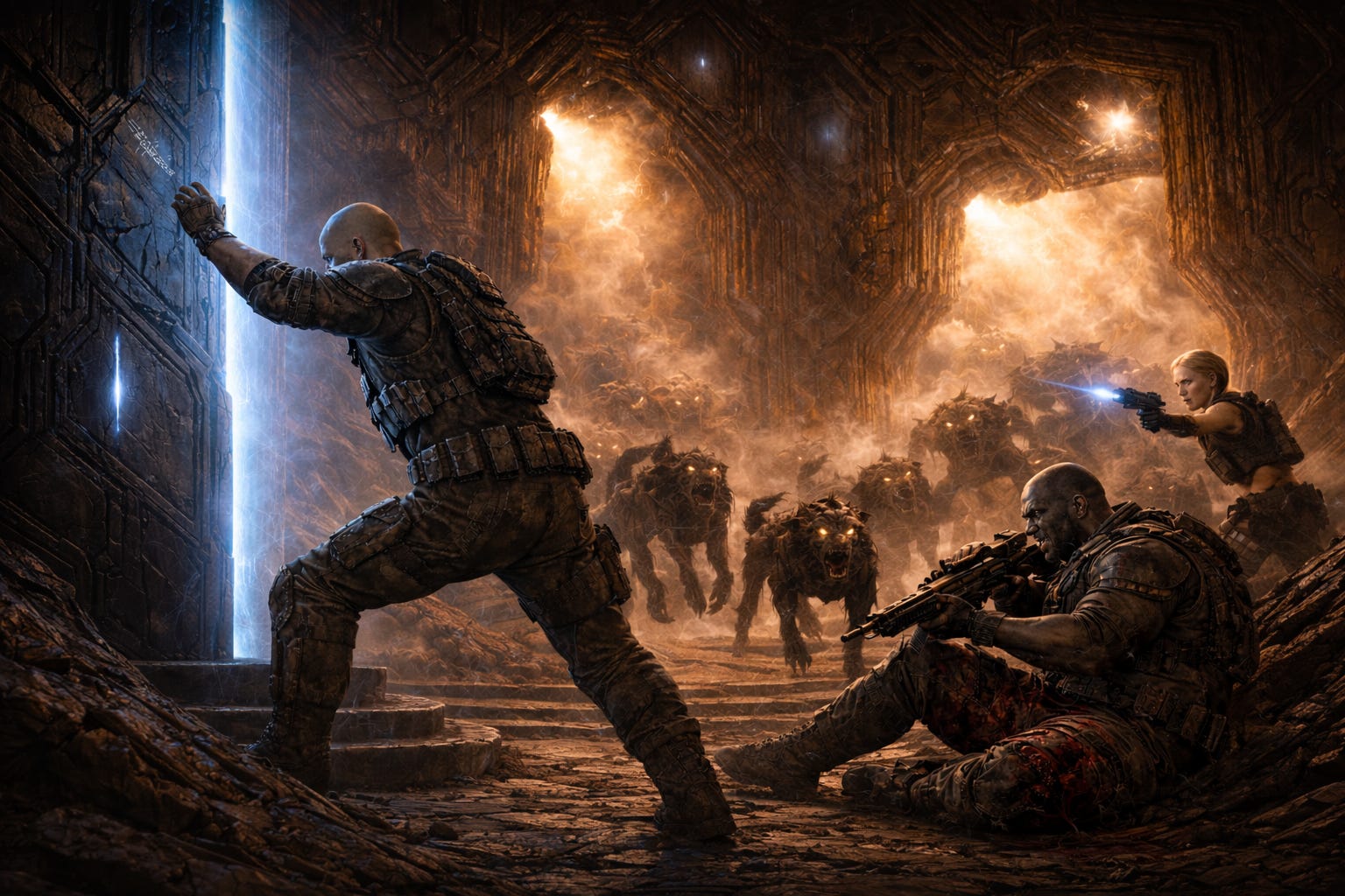 Plasma d’abord. Traits bleus qui brûlent l’air, stoppent net la première ligne. Les fusils gauss prennent le relais. Le tungstène accéléré frappe avec une violence sourde, traverse, pulvérise. Des corps éclatent.