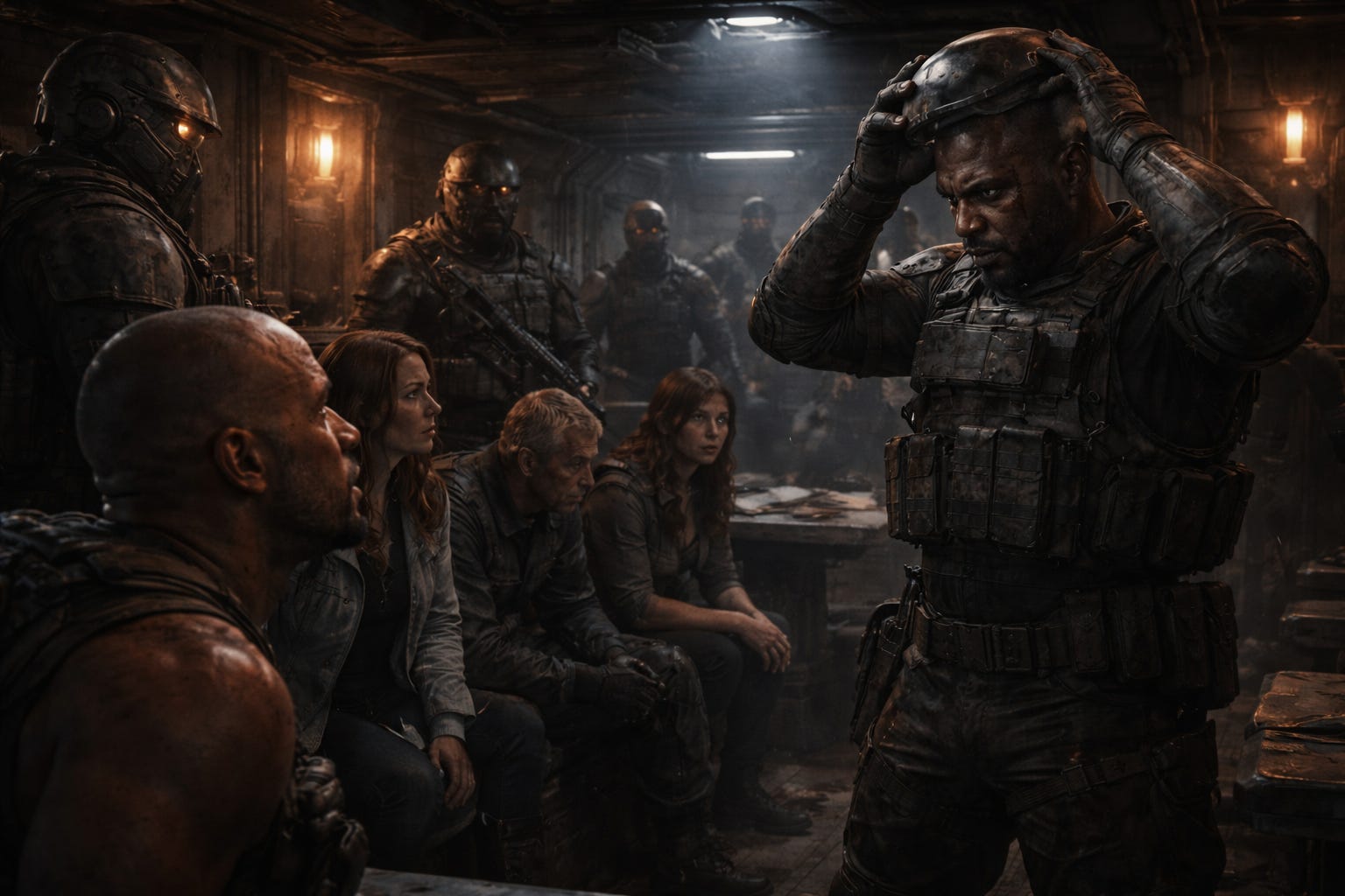 Massif. Imposant. Casque toujours en place. Son exosquelette gronde à chaque pas. Sa présence suffit à remplir la pièce.