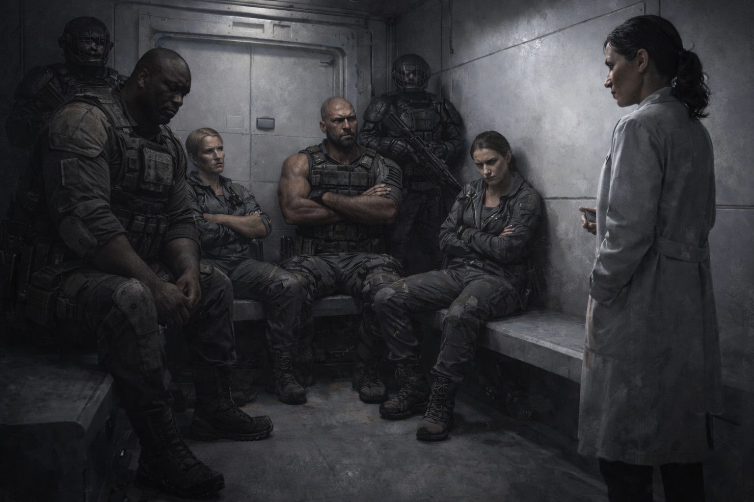 Un banc fixé au mur, une table intégrée, des parois lisses sans aspérités. Aucun écran visible. Aucune fenêtre. Une lumière blanche, constante, qui ne laisse aucune place aux ombres… ni au repos.