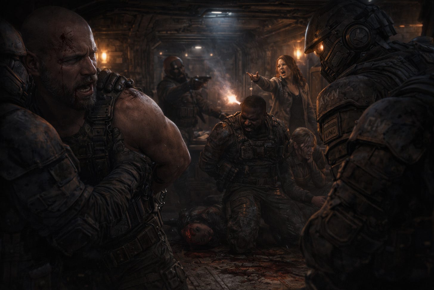 On me traîne hors de la cabine, pieds nus sur le sol glacé. Le métal mord la plante de mes pieds. Chaque pas m’arrache un grognement. Les couloirs du Niña défilent dans une succession de lumières trop blanches, de silhouettes armées en exosquelettes lourds, de bottes qui résonnent.