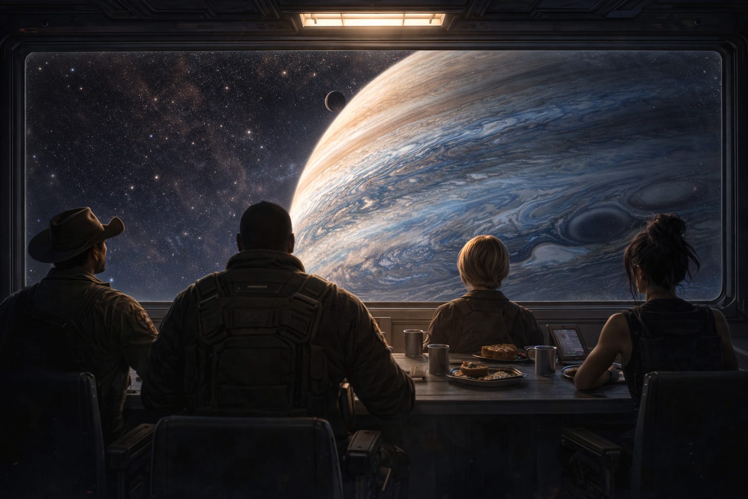 Quelques heures plus tard, la cafétéria du pont intermédiaire baigne dans la lumière diffuse de la géante gazeuse. L’immense planète occupe tout le flanc tribord. Des bandes atmosphériques bleutées et ivoire tourbillonnent lentement. La lumière qu’elle reflète donne à la pièce une teinte froide, presque irréelle.