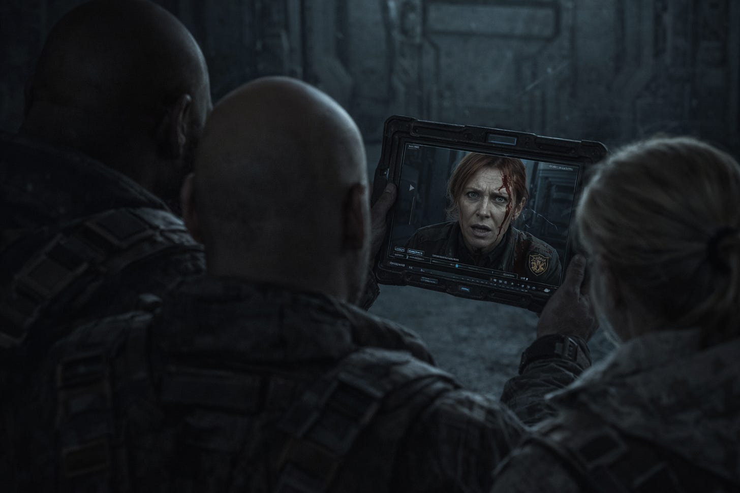 Sur l’écran, c’est la femme du signal brouillé. Mais cette fois, l’image est nette. Claire. Elle a la cinquantaine. Cheveux roux striés de gris. Yeux verts. Du sang sur la tempe. Une ecchymose sur la joue. Derrière elle, une porte blindée. Elle jette des regards paniqués vers l’angle mort, comme si quelque chose grattait juste hors champ. Comme si elle entendait quelque chose approcher.
