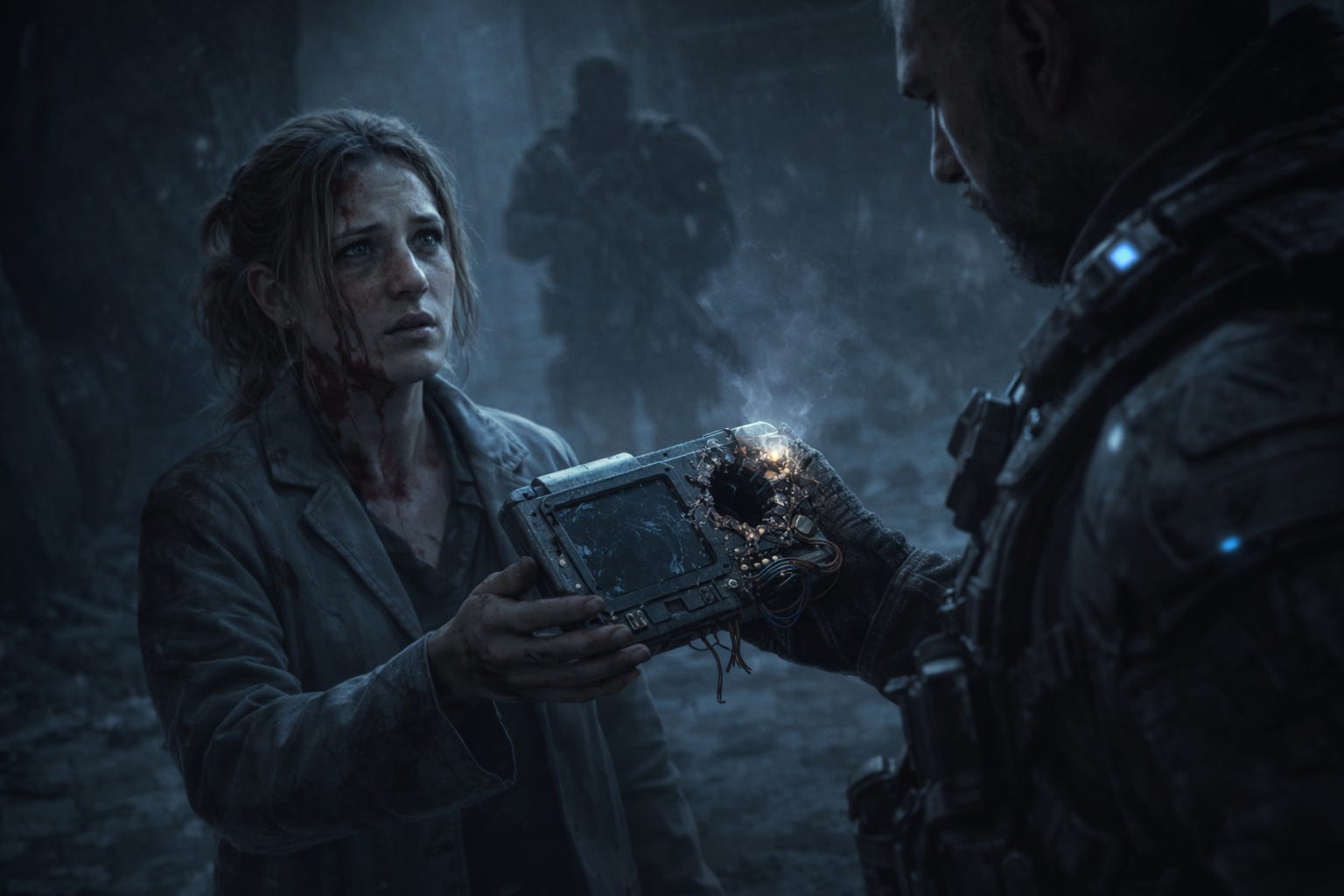 Le boîtier est une ruine. L’écran est éclaté. Pulvérisé. Les composants internes pendent comme des tripes électroniques. Des circuits fondus. Mais ce n’est pas le monstre qui a fait ça. Il y a un impact de balle, net et précis, en plein centre du processeur. Un tir à bout portant. Pas accidentel. Pas improvisé. Volontaire.